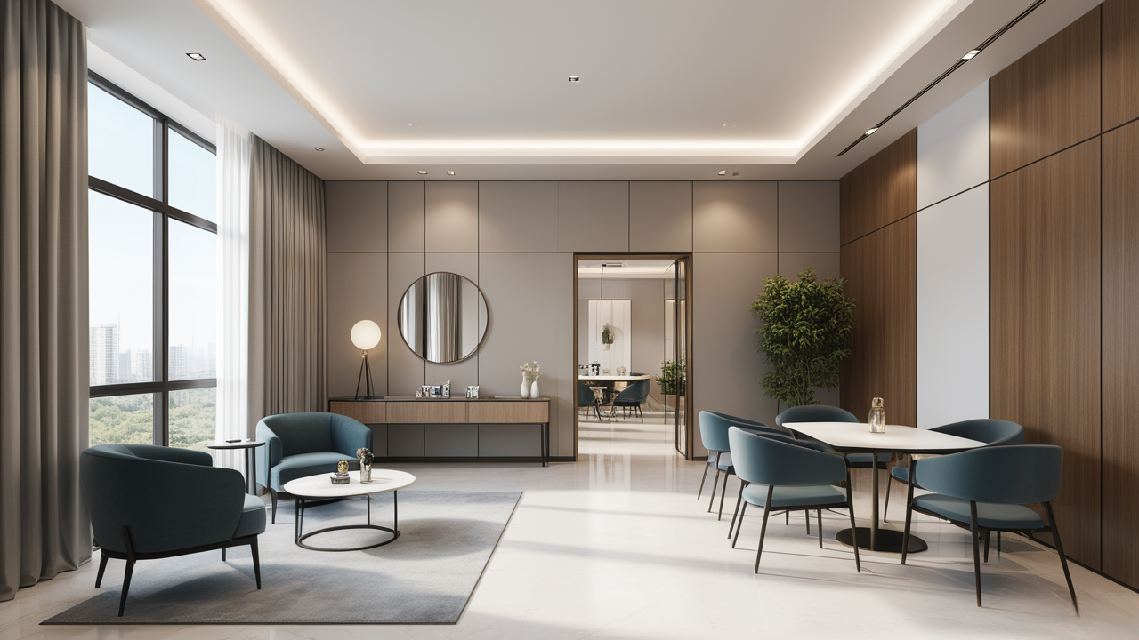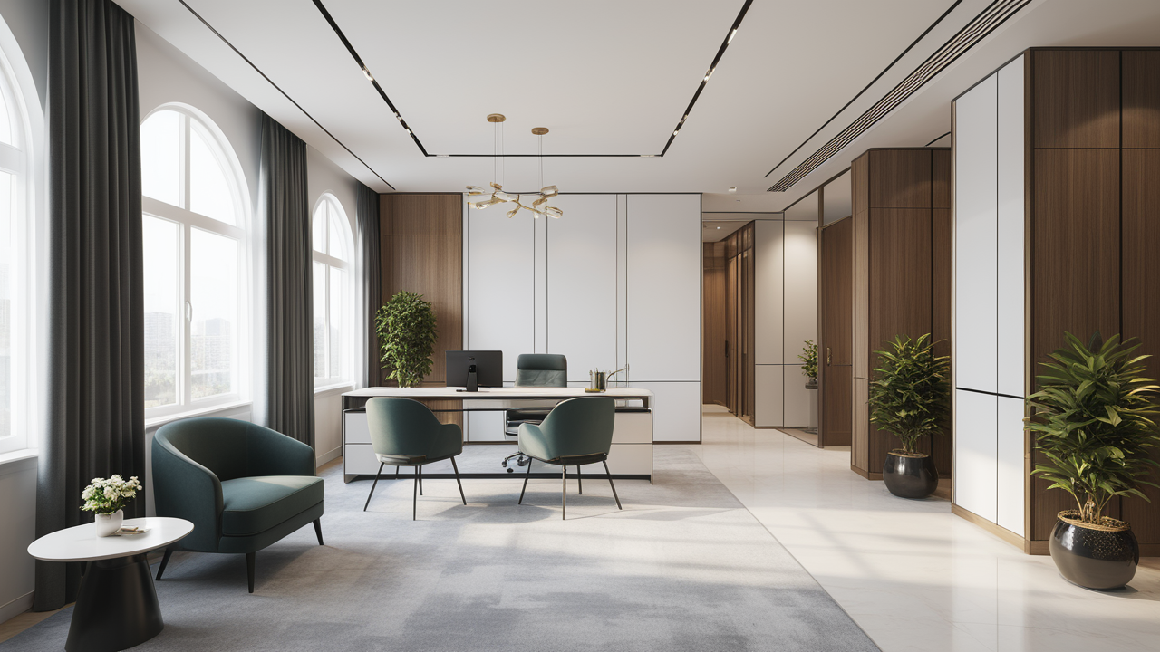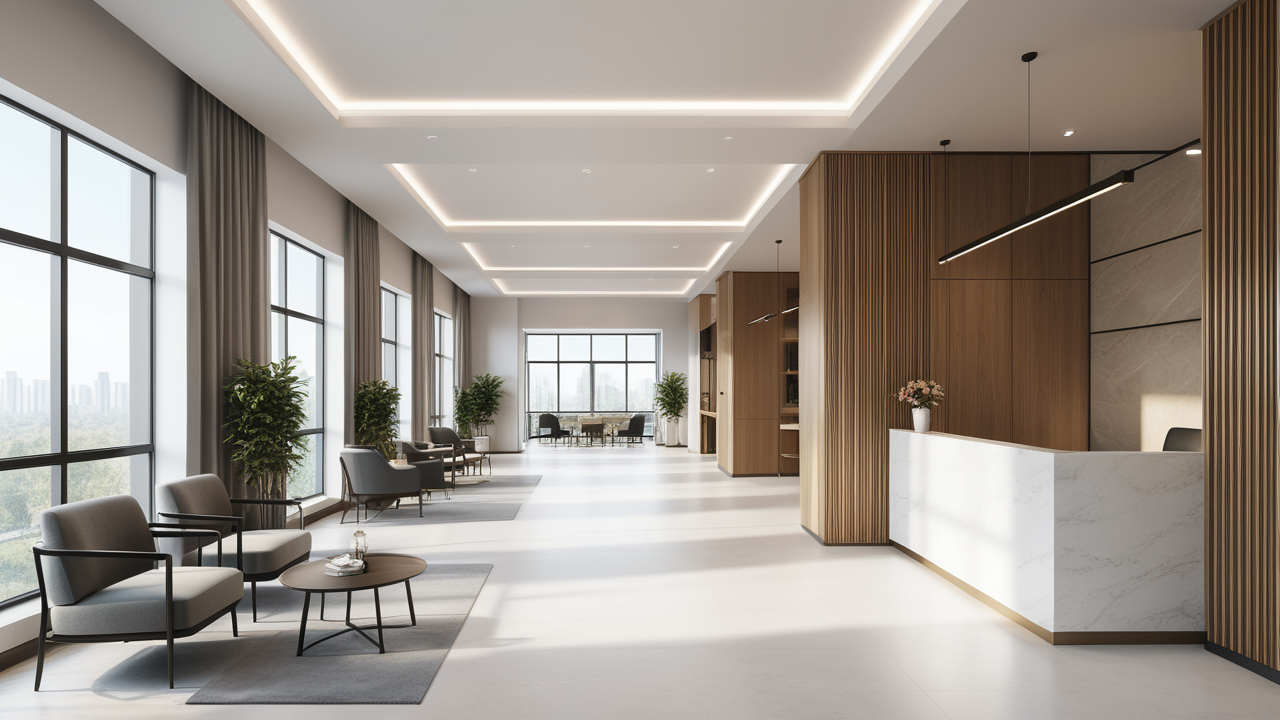 本案設(shè)計首先闖入眼簾的是企業(yè)形象墻,以其企業(yè)文化的新興、蓬勃、嚴(yán)謹(jǐn)為主題,兩側(cè)以“居有竹、步步高”的銀色墻柱帶來視覺沖擊感,加上企業(yè)形象色的類比色、淺色石材及不銹鋼條的運用,顯示出金屬的質(zhì)感和工業(yè)文明的主題;華堂上方呼應(yīng)以直線為主調(diào)、大筆勾勒而出的時尚型弧面吊頂,大直大方顯示出強烈的縱深感,加之以清透、明媚的光色渲染,工整氣派、大家風(fēng)范,反襯出貴公司辦公樓的現(xiàn)代時尚特性,以干練快捷的設(shè)計節(jié)奏,展示出質(zhì)量與效率并舉的時代精神。