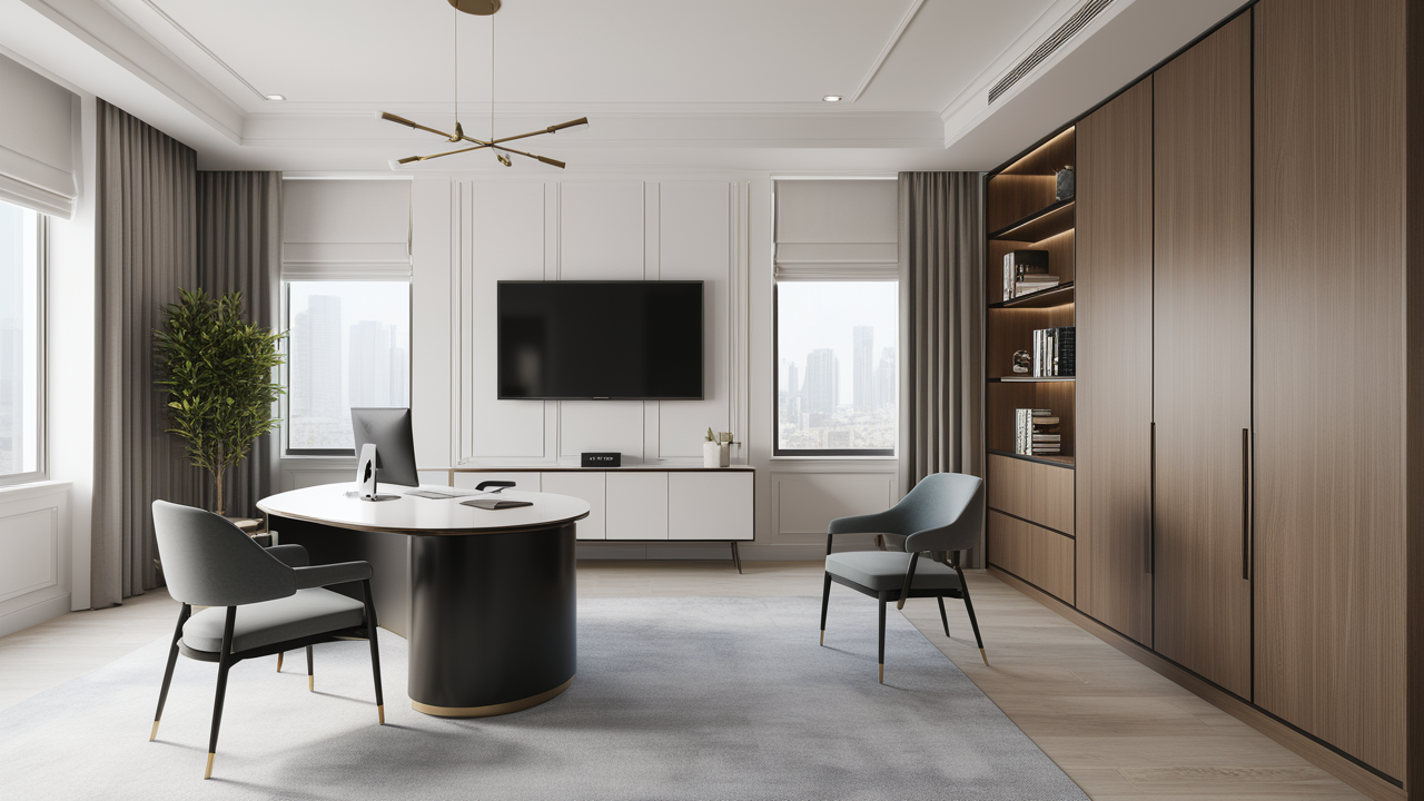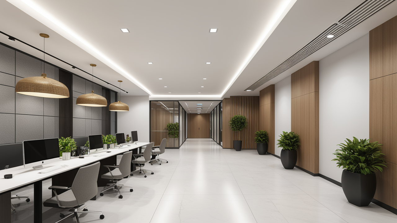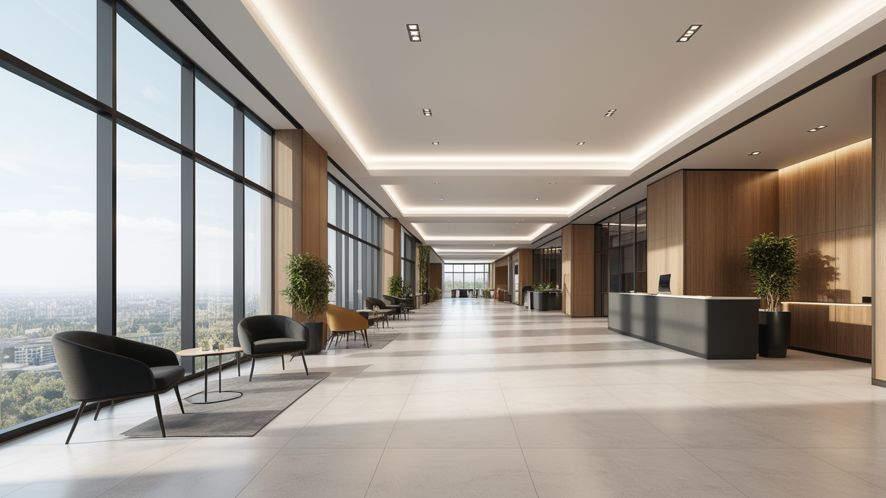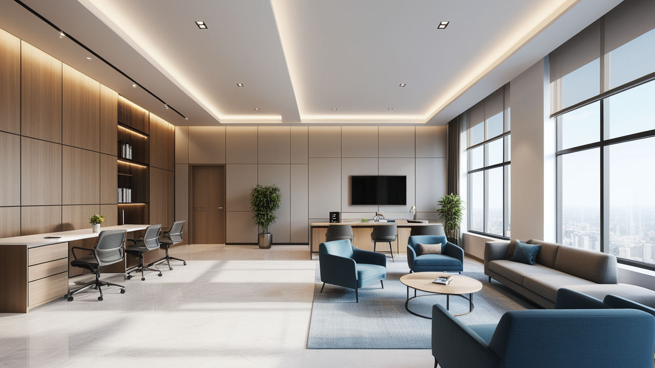 本案設(shè)計首先闖入眼簾的是企業(yè)形象墻,以其企業(yè)文化的新興、蓬勃、嚴(yán)謹(jǐn)為主題,兩側(cè)以“居有竹、步步高”的銀色墻柱帶來視覺沖擊感,加上企業(yè)形象色的類比色、淺色石材及不銹鋼條的運用,顯示出金屬的質(zhì)感和工業(yè)文明的主題;華堂上方呼應(yīng)以直線為主調(diào)、大筆勾勒而出的時尚型弧面吊頂,大直大方顯示出強烈的縱深感,加之以清透、明媚的光色渲染,工整氣派、大家風(fēng)范,反襯出貴公司辦公樓的現(xiàn)代時尚特性,以干練快捷的設(shè)計節(jié)奏,展示出質(zhì)量與效率并舉的時代精神。