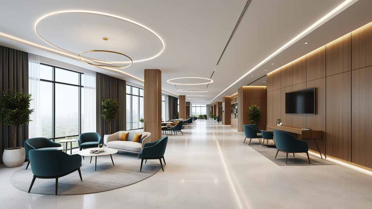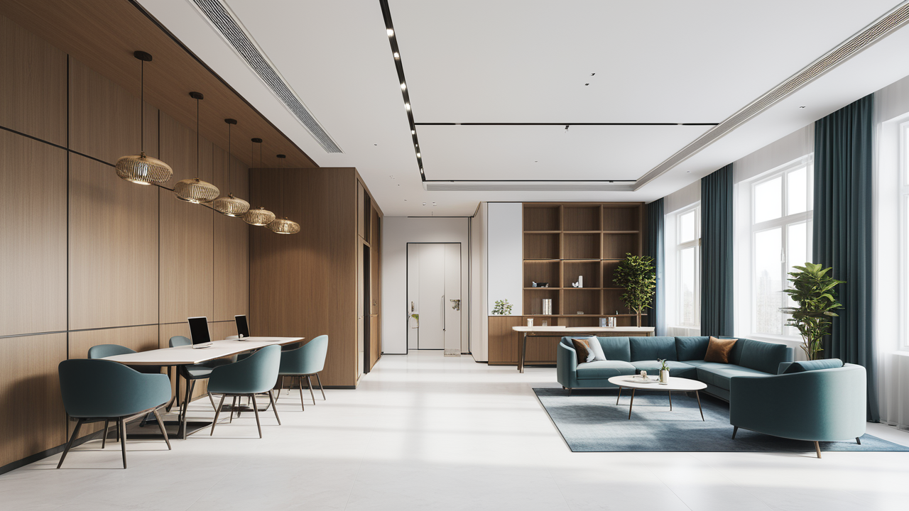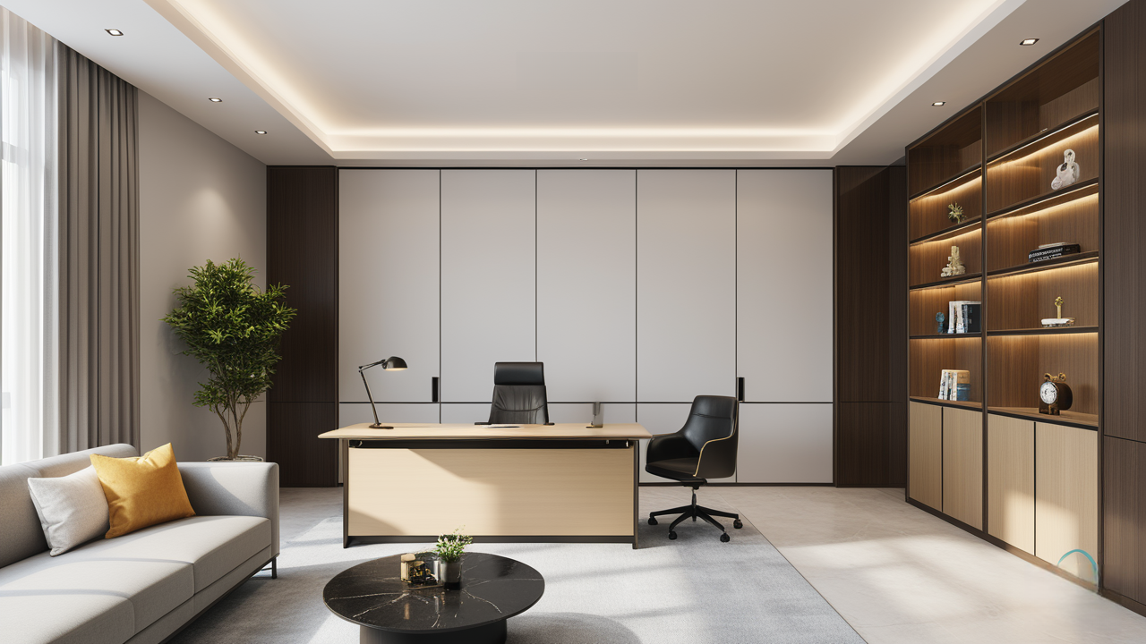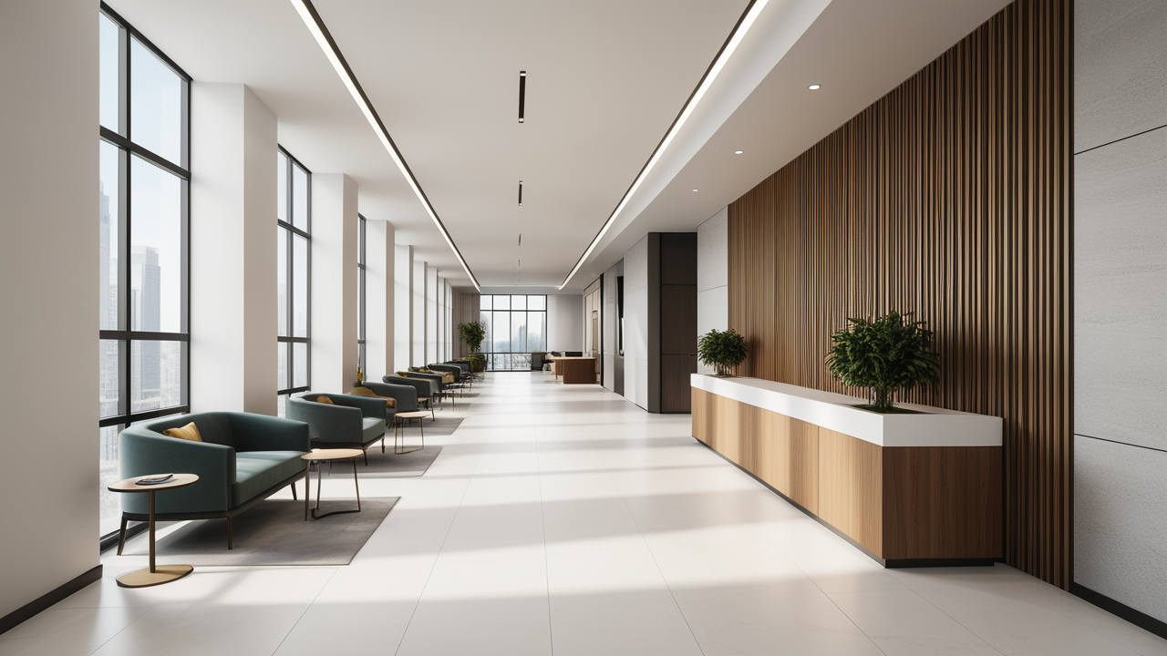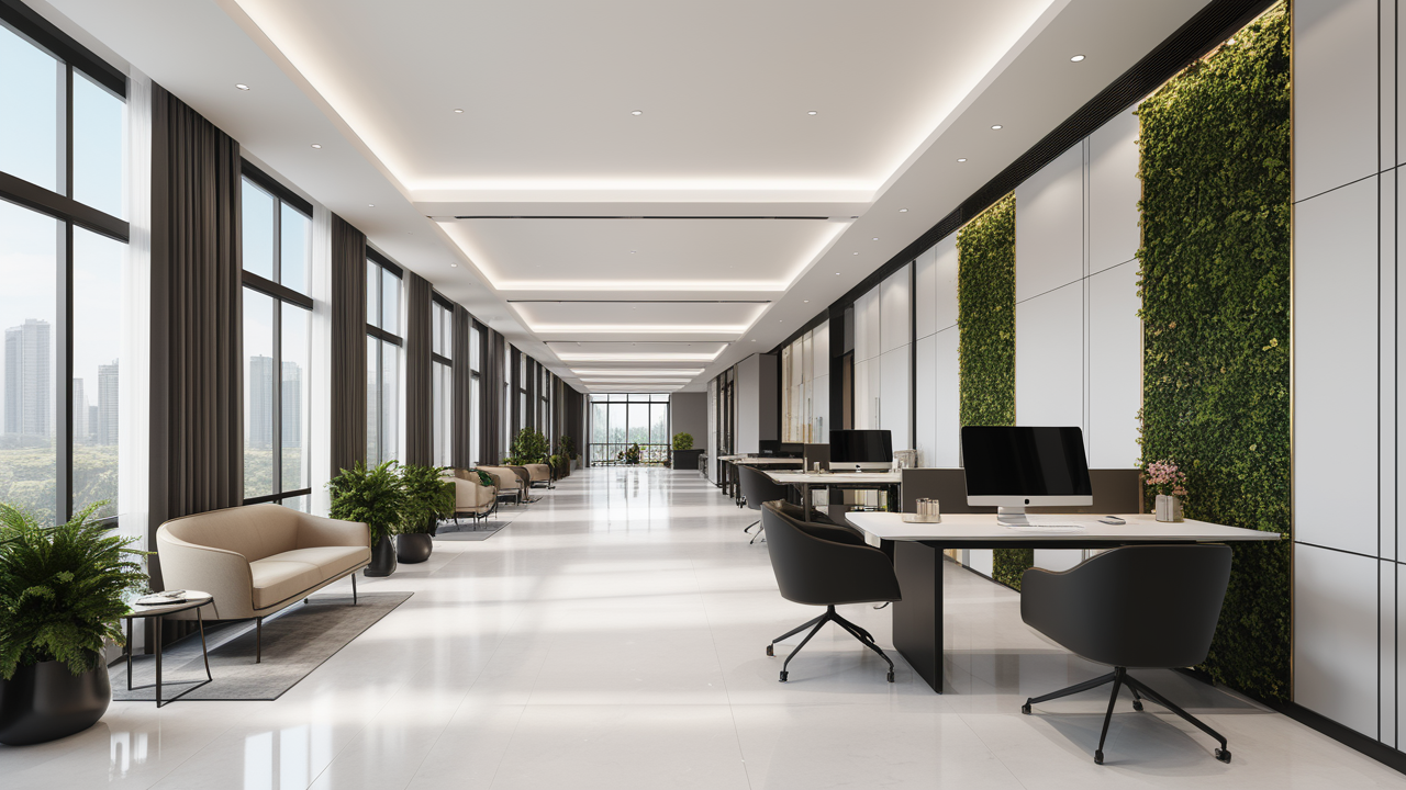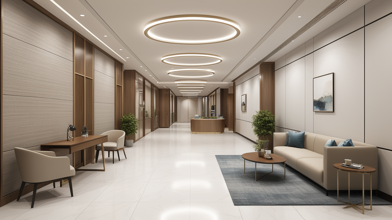 本案設(shè)計為突顯建筑開間較舒適之優(yōu)點,設(shè)計師特意設(shè)計了過道各柱體間鑲嵌不銹鋼條及玻璃幕墻上的磨砂條來點綴的裝修主題,同時,地面用拼花色帶打破,與方正而美觀的吊頂上下呼應(yīng);辦公室靠近走道的墻面,為將自然光透入走道,同時又加強其“靈透”感,采用清玻幕墻,幕墻上的磨砂條既打破了玻璃墻面的呆板,又提醒了行人幕墻的存在,防止無意識碰頭、沖撞等類似意外發(fā)生;為辦公室的后續(xù)私密性考慮,其清玻幕墻內(nèi)掛以百葉窗遮擋既可。