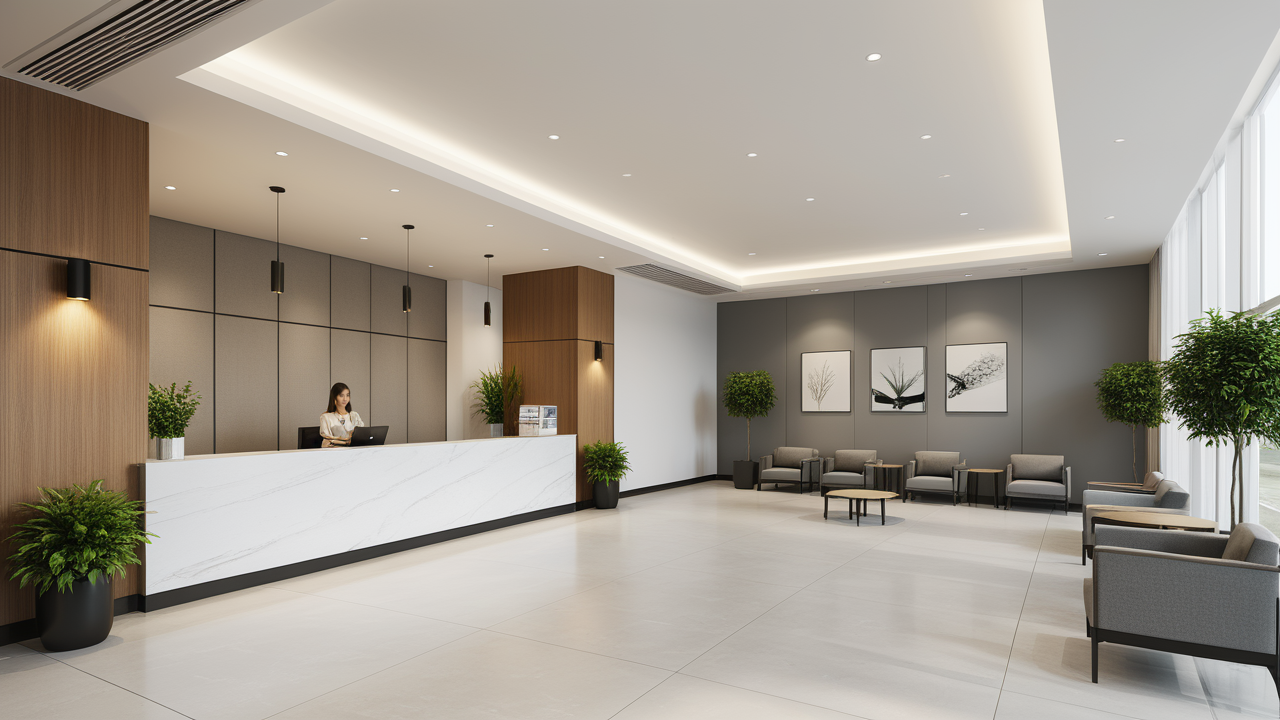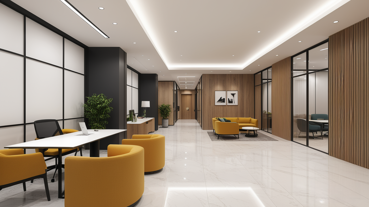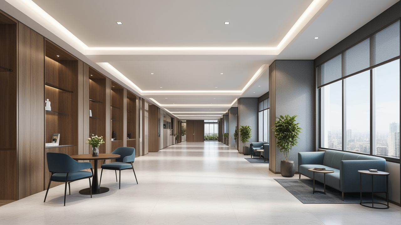 本案在這個辦公室設計中,甲方要求,有功能區設置,有總經理,總經理是本公司中最高的職務,所以在我的設計中給他選擇了一個比較好的朝向,采光比較好、地面采用仿古顯紋復合強化淺色木地板。防滑耐磨。幾何式的辦公桌莊嚴不失人性化。自然的美巧妙的運用到設計之中,突顯對美好生活的向往。放松工作時的狀態,副總經理兩間,裝修風格跟總經理相符,比較統一。會議室,在平面功能上。考慮了合理的行動路線,東面墻對應窗的位置設計了落地的玉砂玻璃隔墻,以滿足展示區的采光要求。