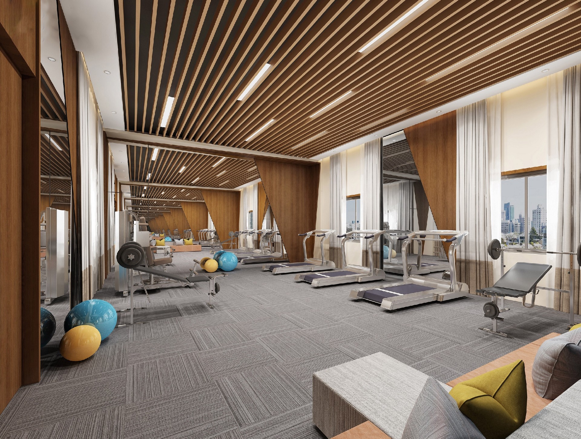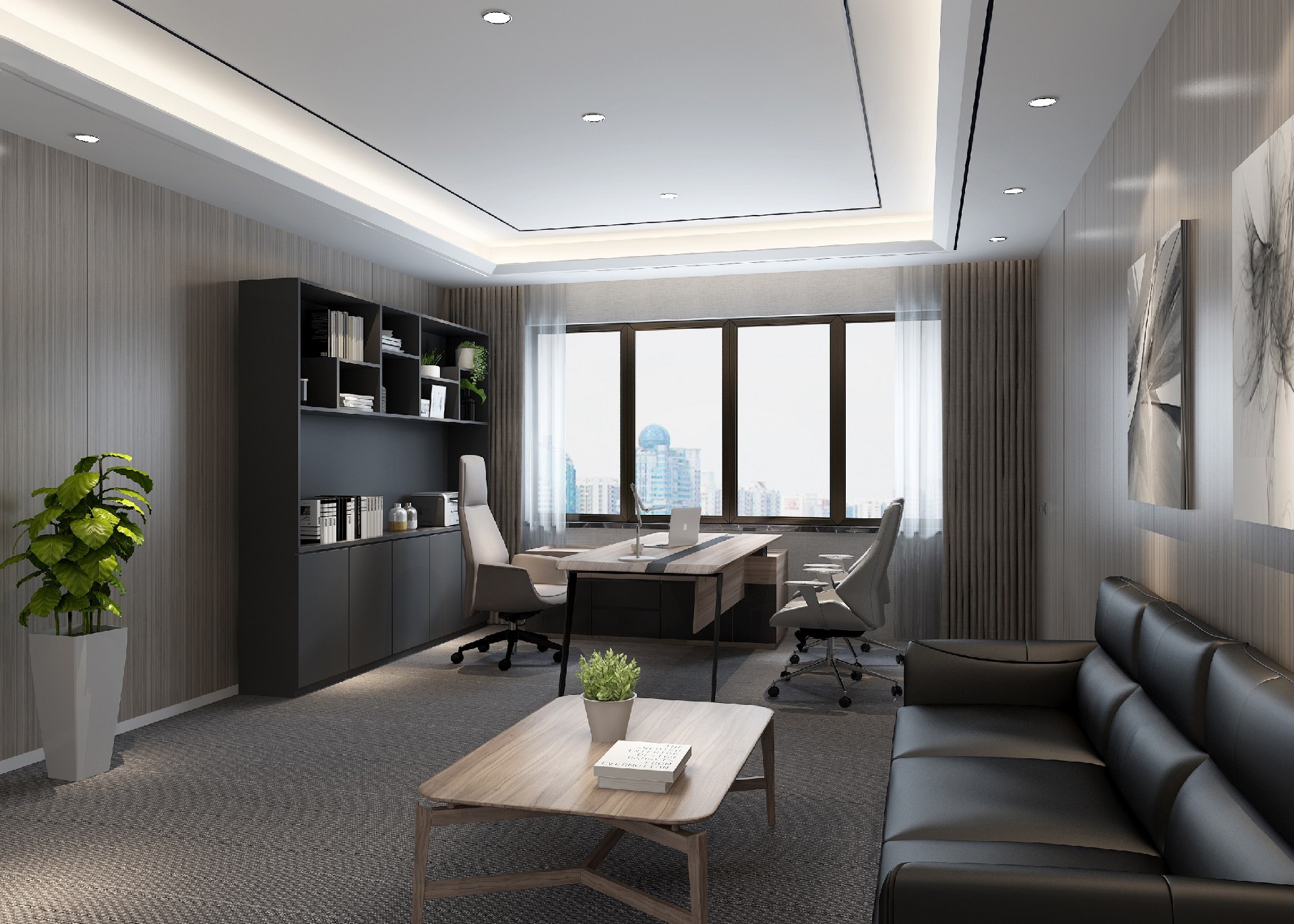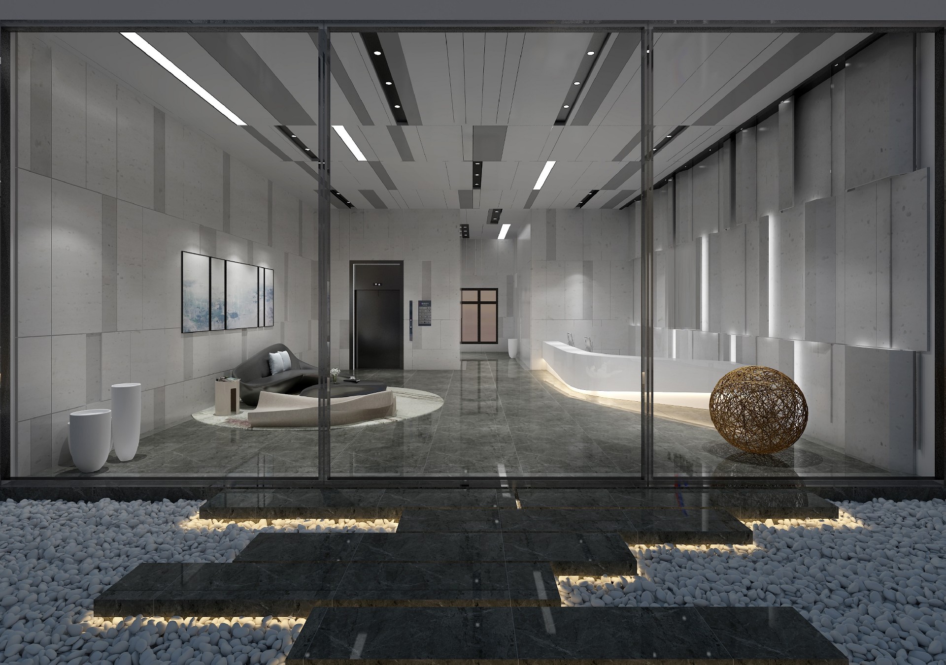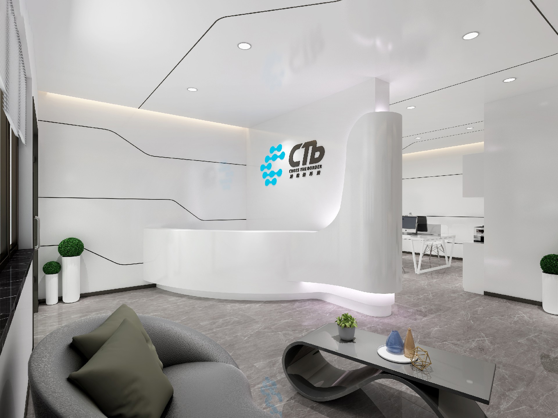 本案設計中企業形象墻,以其企業文化的新興、蓬勃、嚴謹為主題,兩側以“居有竹、步步高”的銀色墻柱帶來視覺沖擊感,加上企業形象色的類比色、淺色石材及不銹鋼條的運用,顯示出金屬的質感和工業文明的主題;然而休息區的陳設卻明麗蔥郁,充滿人文情感的自然氣息,恰恰彌補了視覺中的剛硬個冷竣,使人倍感親切。