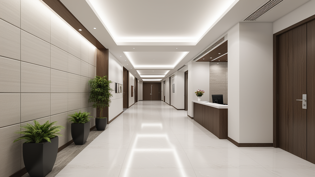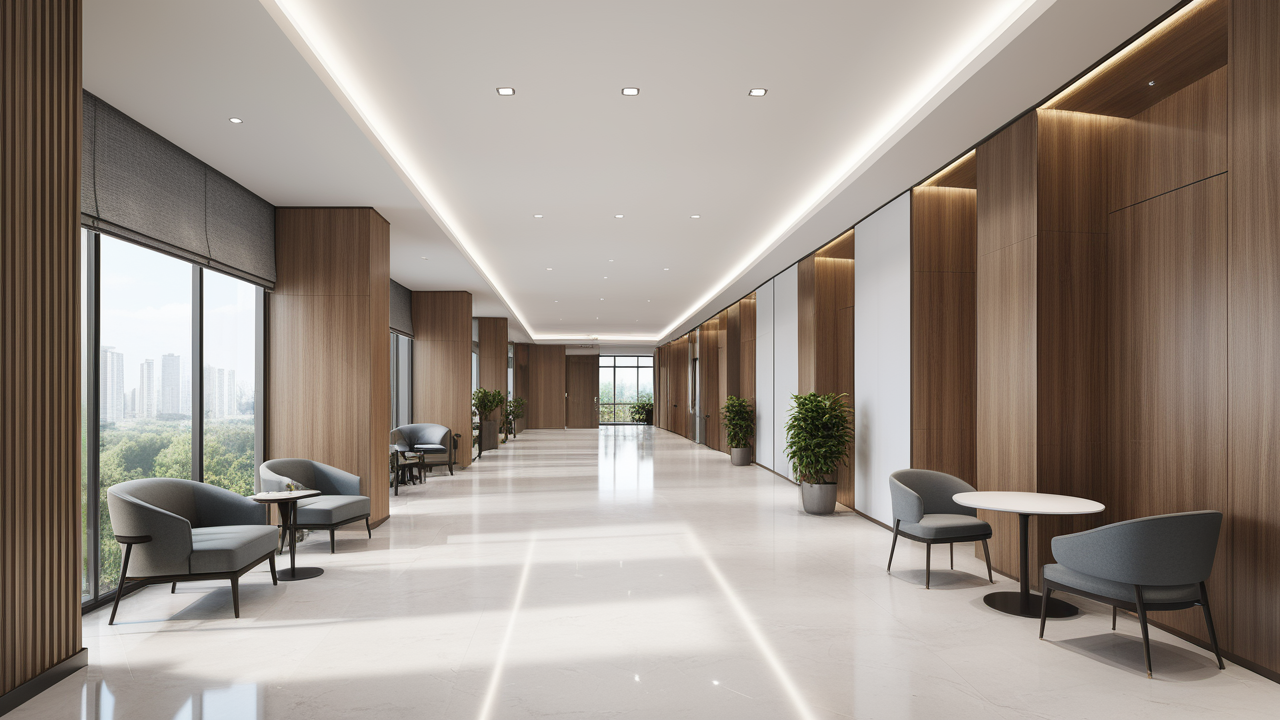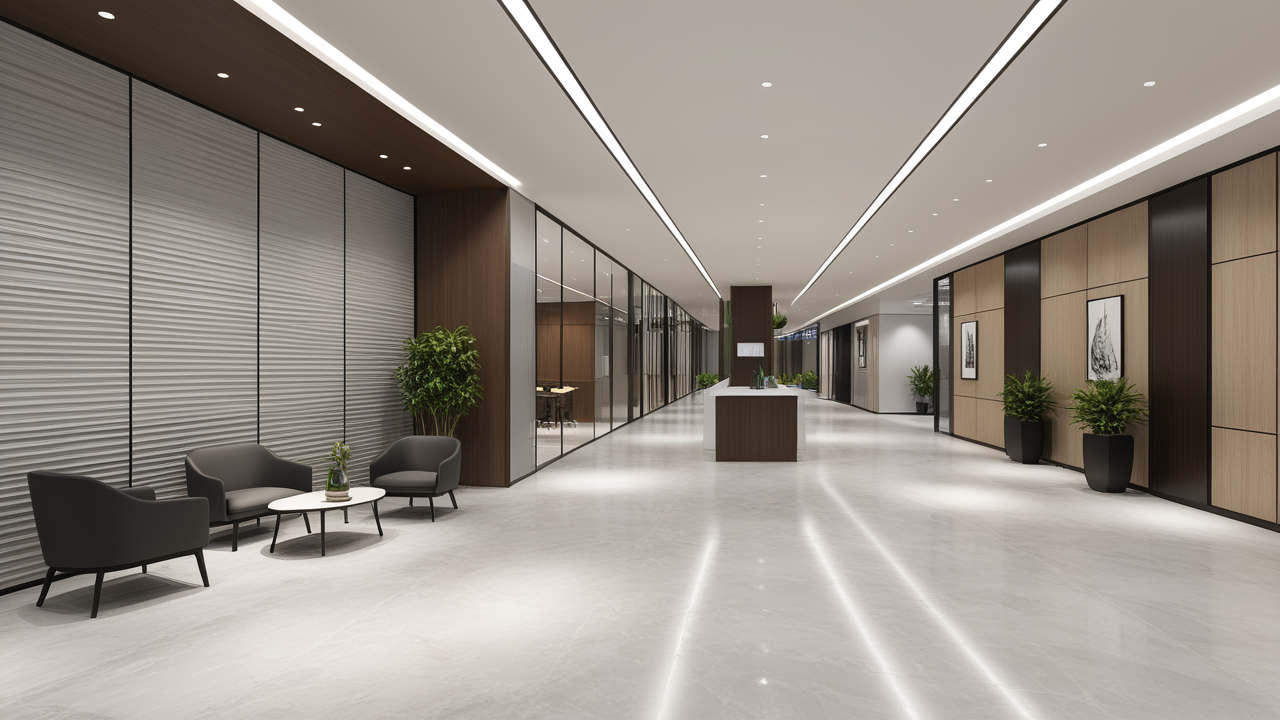 本案設計為突顯建筑開間較舒適之優點,設計師特意設計了過道各柱體間鑲嵌不銹鋼條及玻璃幕墻上的磨砂條來點綴的裝修主題,同時,地面用拼花色帶打破,與方正而美觀的吊頂上下呼應;辦公室靠近走道的墻面,為將自然光透入走道,同時又加強其“靈透”感,采用清玻幕墻,幕墻上的磨砂條既打破了玻璃墻面的呆板,又提醒了行人幕墻的存在,防止無意識碰頭、沖撞等類似意外發生;為辦公室的后續私密性考慮,其清玻幕墻內掛以百葉窗遮擋既可。